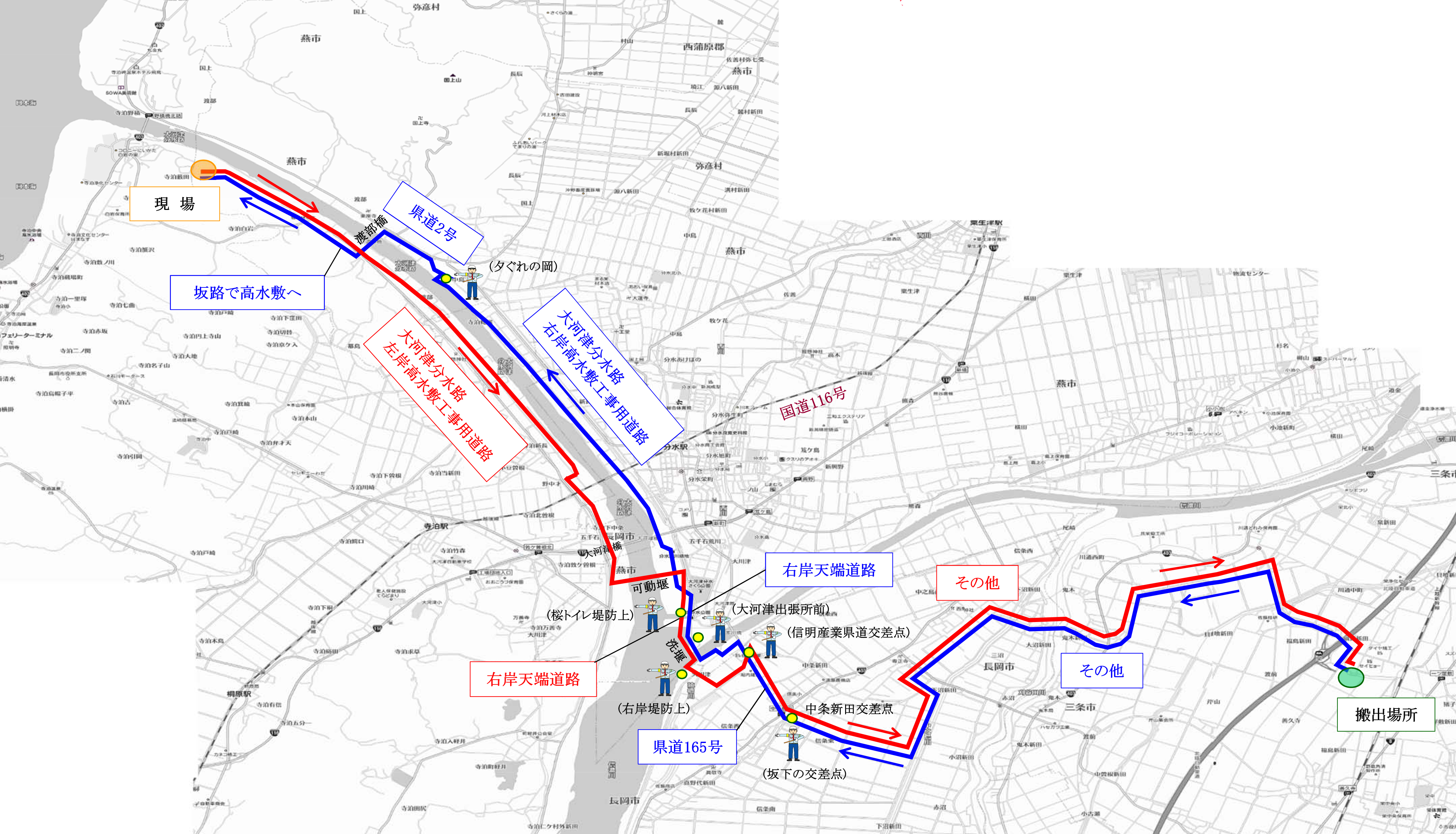 現場 〜 大河津分水路左岸高水敷道路 〜 可動堰 〜 右岸天端道路 〜 洗堰 〜 その他 〜 県道165号 〜 その他 〜 搬出先